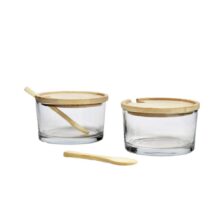 Amuse-set van 2 glazen potjes met bamboe deksel en lepel.